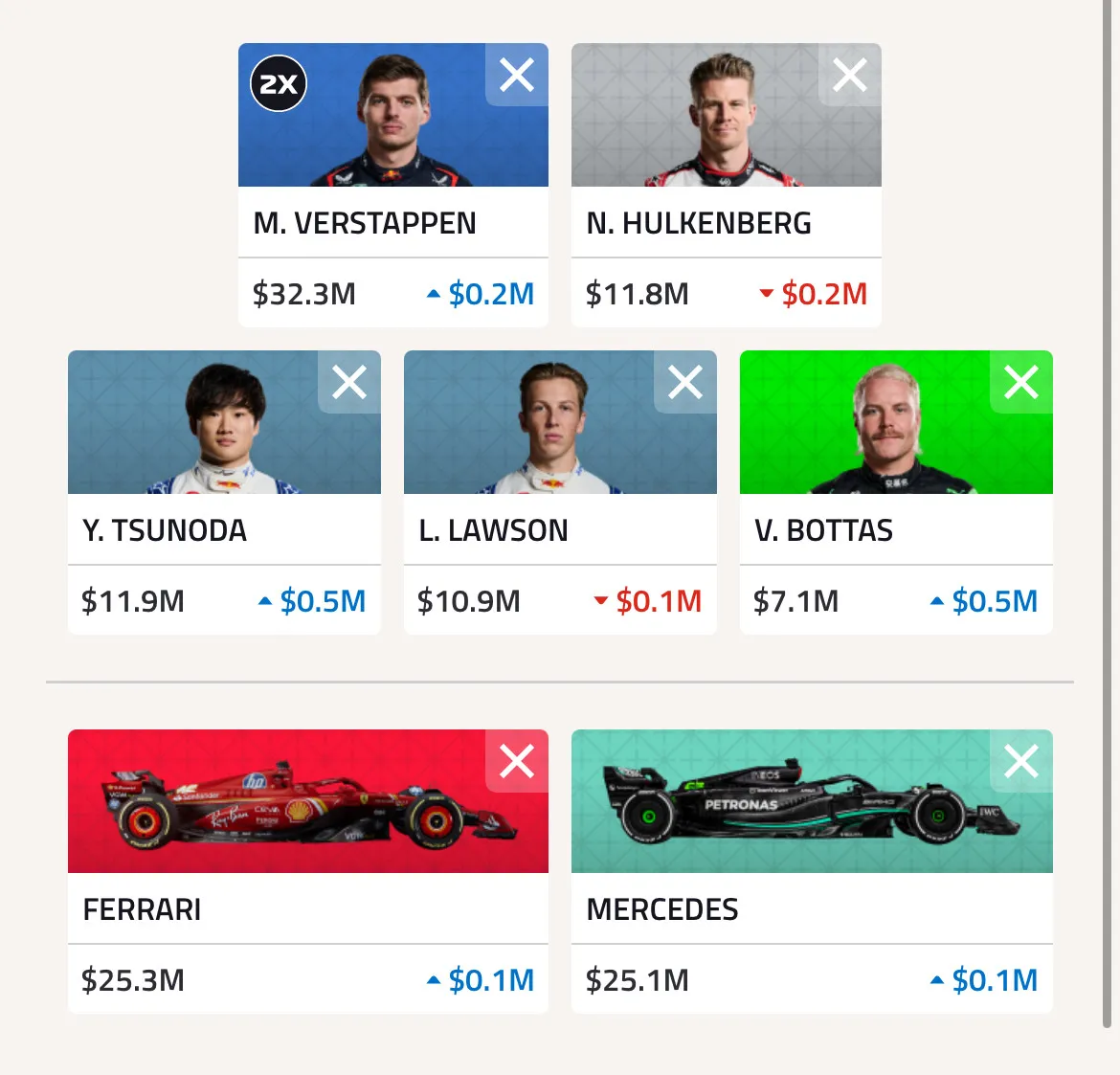 For strategists looking to avoid the disaster-prone Williams team, this lineup builds around Max with the hopes of a fifth straight win at Yas Marina. Three high end midfield options at a high overtake circuit offers some promise in a high-scoring affair, while the VCARB duo of Tsunoda and Lawson have a lot to gain (or lose) with a strong performance this weekend.