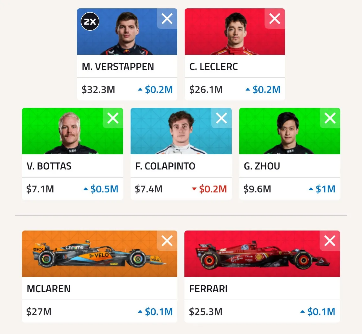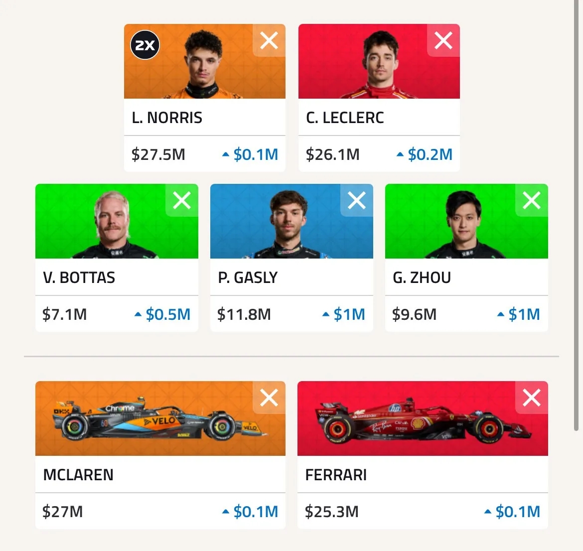 This lineup costs more than it used to after Pierre Gasly and Zhou Guanyu each landed $1.0M price gains at Qatar. For teams looking to make small inroads on a league leader, this lineup crucially removes Colapinto to reduce the risk of DNFs. Moving the 2X DRS Boost onto Leclerc enables another potential gain.