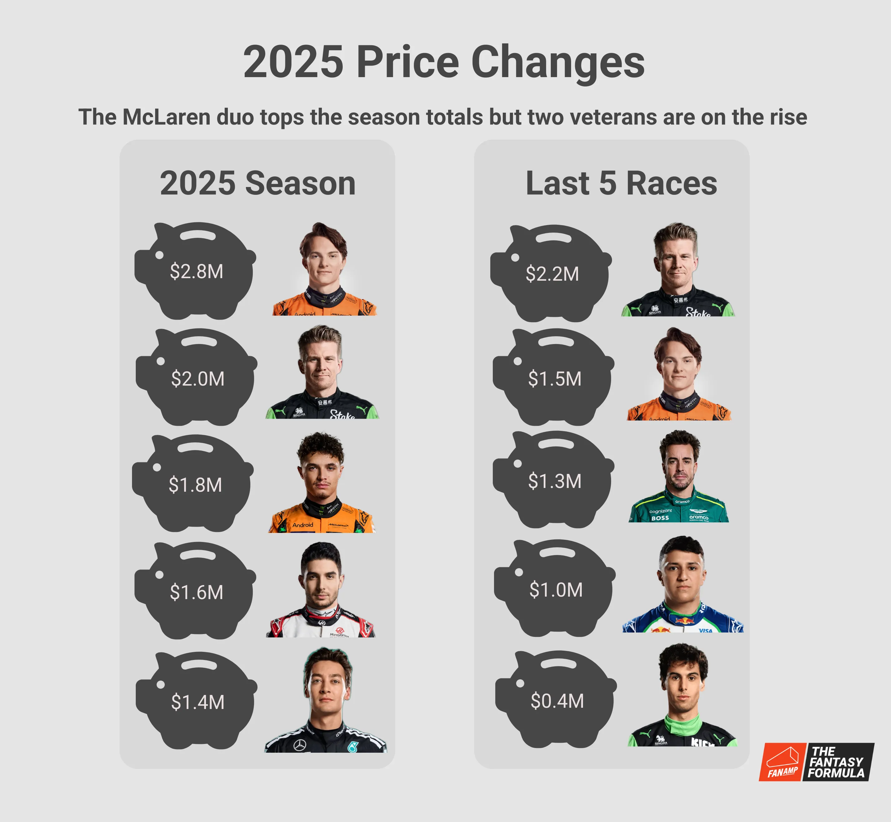The new price gain algorithm for 2025 brought larger risks and rewards for drivers. Championship leader, Oscar Piastri, leads all drivers in value gained after growing his value in the last 11 races. Nico Hulkenberg offset his losses at Bahrain, Jeddah, and Miami by gaining $0.6M in four straight. The Sauber constructor meanwhile, is riding a six-race streak of $0.6M gains. An underappreciated constructor, Haas lead all assets in value gained at $4.4M and grew by $0.6M in nine of the first twelve races!